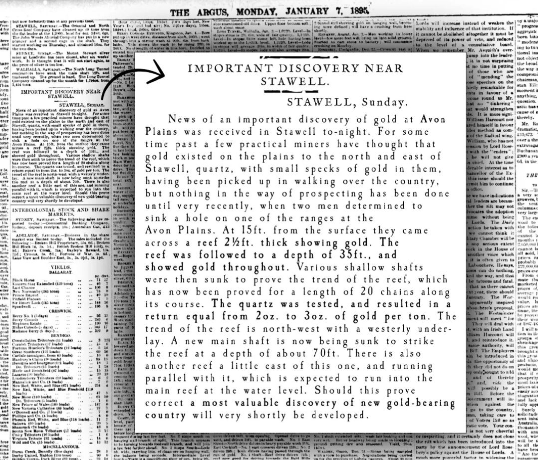 Avon Plains has one hell of a backstory. Back in the 1890s, newspaper clippings from the time describe assays of 2–3 oz/t (around 60–90 g/t) that miners were pulling from shallow shafts.