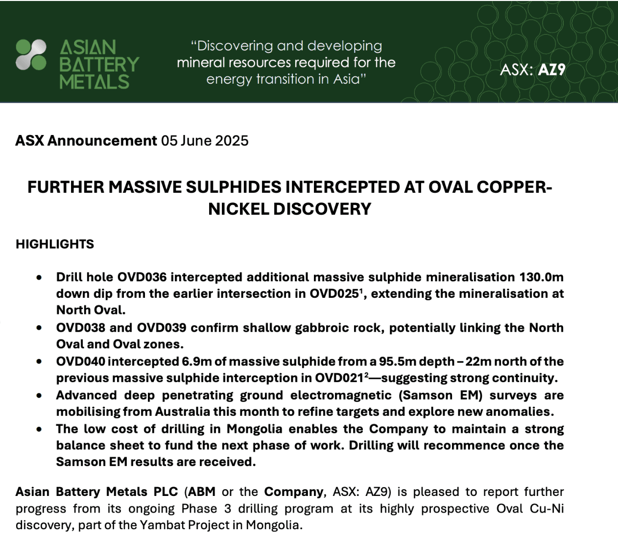 Asian Battery Metals (ASX: AZ9) has delivered yet another impressive update from its Oval copper-nickel discovery in Mongolia.