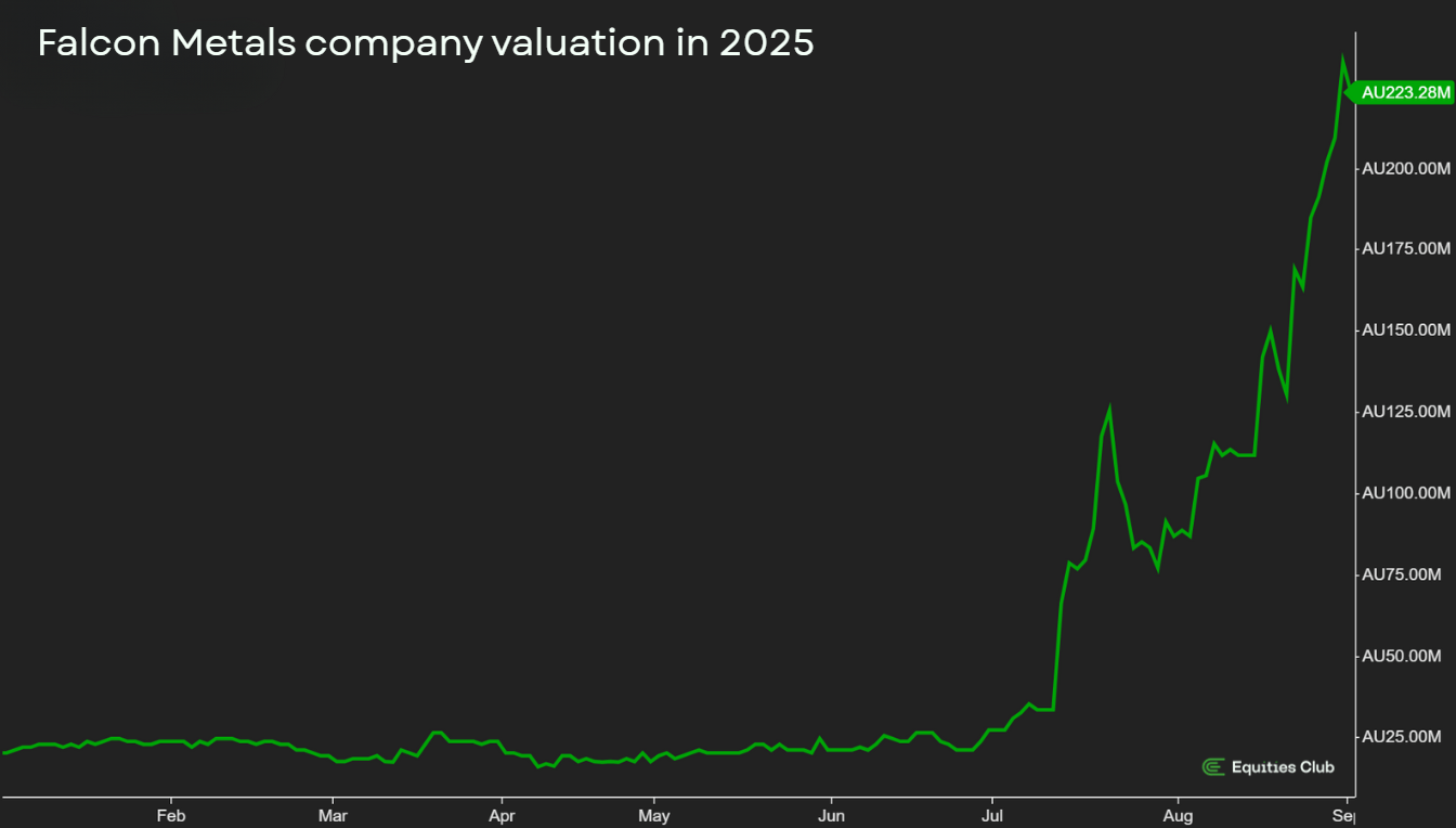 - Blue Moon (Falcon Metals, ASX: FAL): High-grade hits including 1.2m @ 543 g/t gold and 2.8m @ 17.7 g/t gold, driving Falcon’s market cap from $20m to $223m