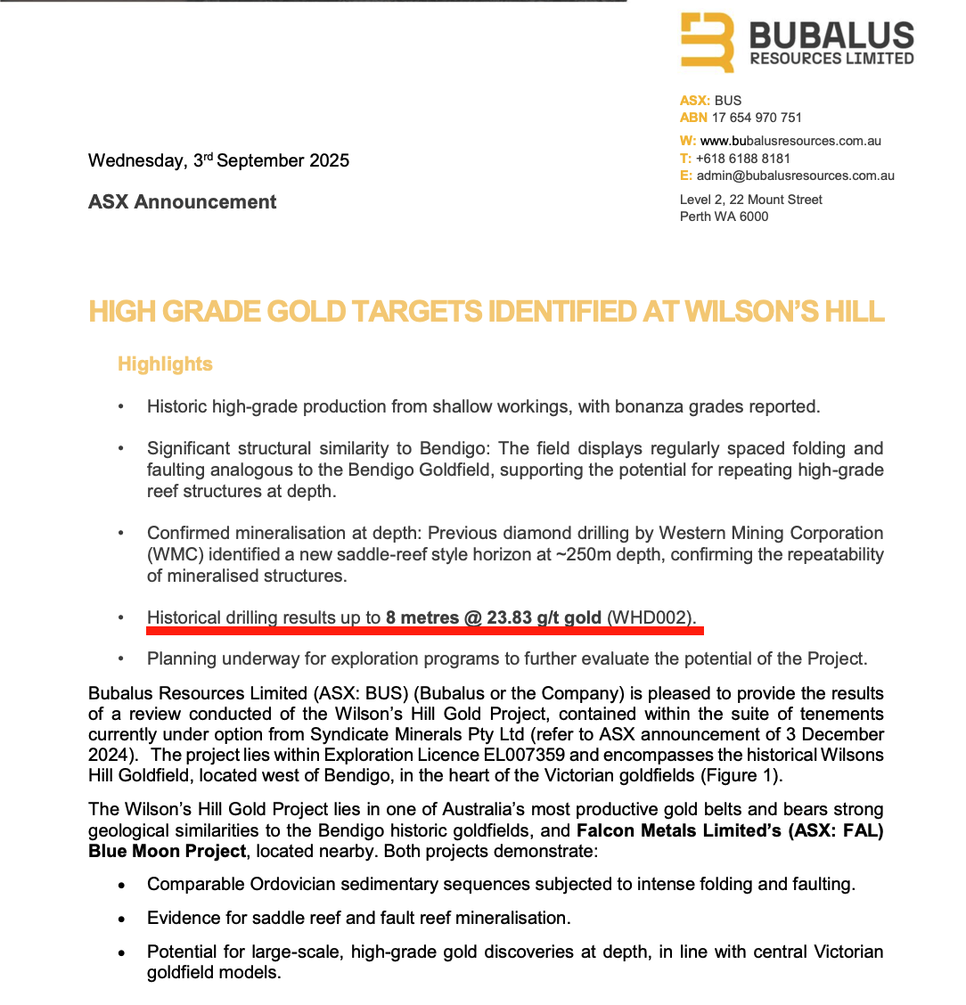 If that grade of gold were mined today, it would place Wilson’s Hill as the highest-grade gold producer in Australia.
