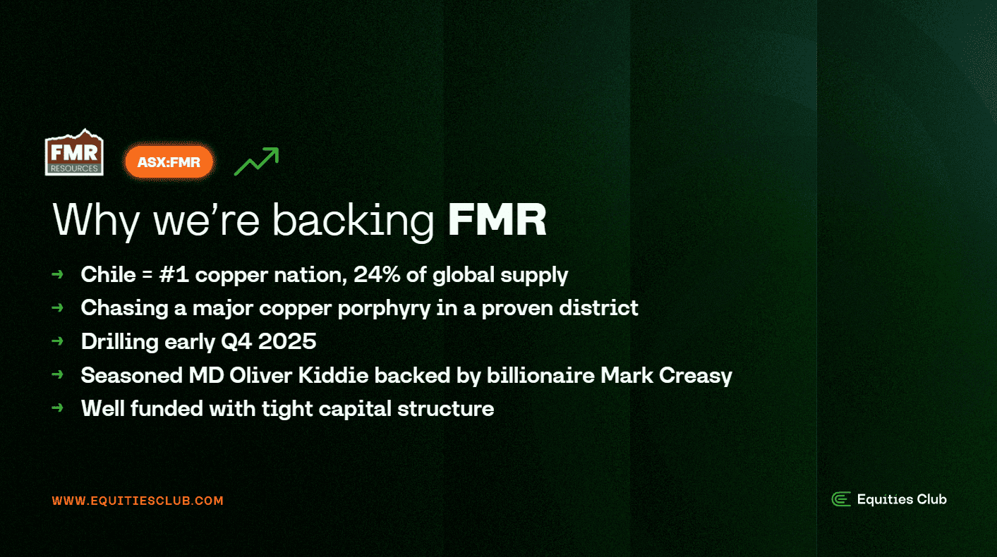 We first called FMR Resources at 17c in our Ebook earlier this year, backing the team behind it. Now that they hold a serious copper project, we’re doubling down.