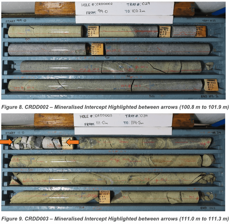 - CRDD002: 1.1 m @ 9.4 g/t gold (including 0.2 m @ 50 g/t), plus silver and bismuth.