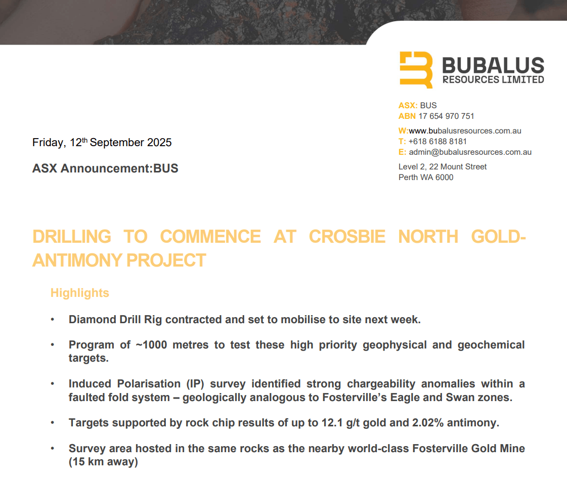 Bubalus Resources (ASX: BUS) is about to drill its Crosbie North gold-antimony prospect, just as gold smashes through US$3,600 and Goldman Sachs starts talking about US$5,000 per ounce.