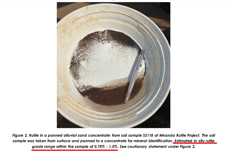 Early soil sampling work and auger drilling have already pulled visible rutile grains from the pan, with estimated in-situ grades of 0.75–1.5%.