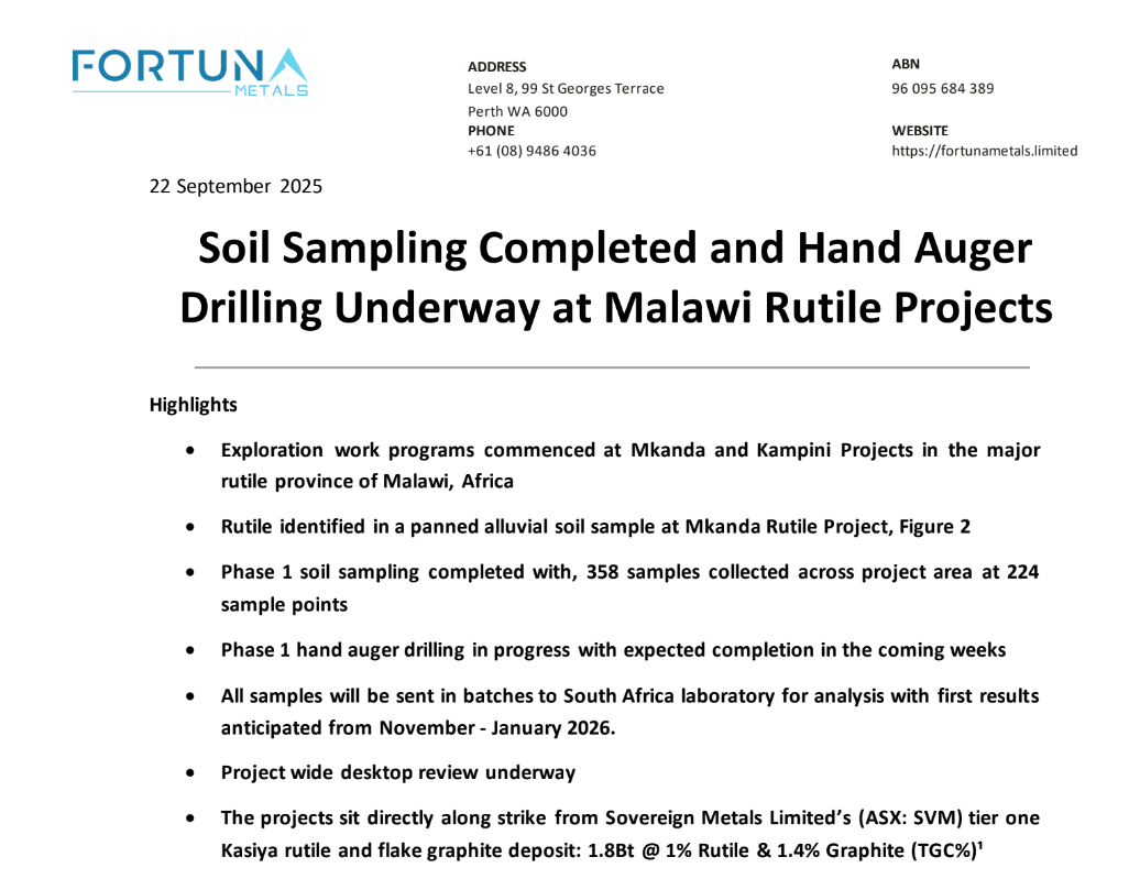 Fortuna Metals (ASX: FUN) advances Malawi rutile exploration