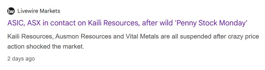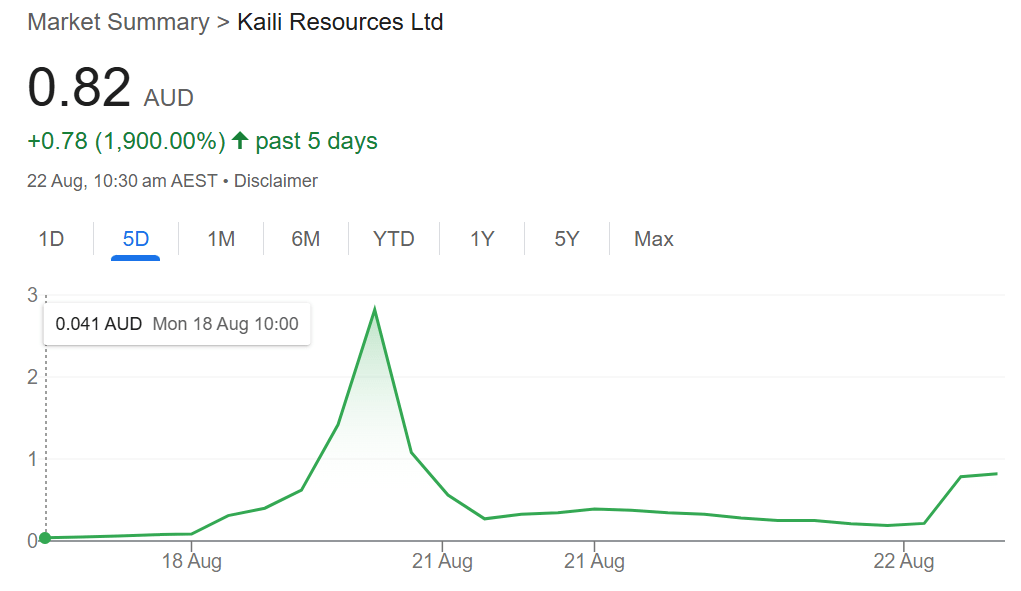 - Friday, 22 August – KLR surged again, from 19c to 82c – a 331% rise on no fresh news. The ASX once more hit pause, with trading set to resume on Monday.