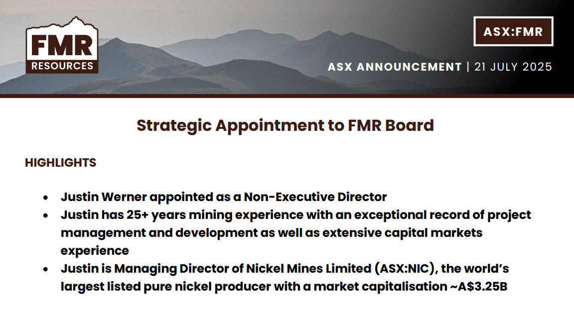 - FMR lands industry heavyweight Nickel Industries CEO Justin Werner as director.
