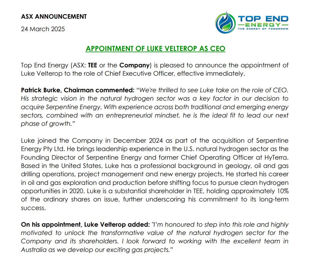 Top End Energy (ASX: TEE) appointed Luke Velterop as CEO this week, bringing serious natural hydrogen expertise to the helm at a critical time for the company.