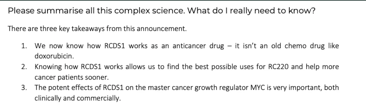 Race is now planning additional studies to identify the best market opportunities and clinical trial strategies for its RC220 formulation, targeting solid tumours and leukaemia.