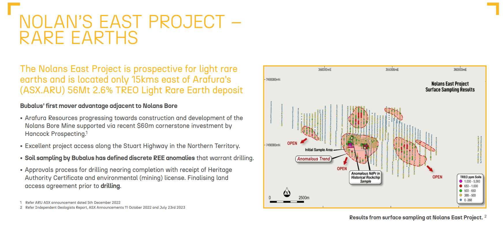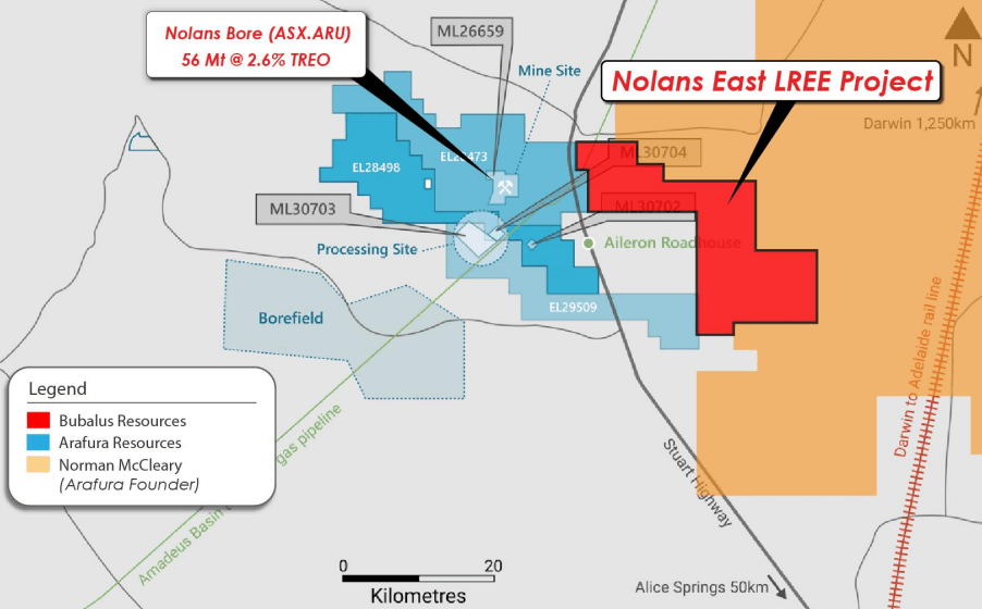 In the Northern Territory, our portfolio company Bubalus Resources (ASX: BUS), holds ground directly beside ARU’s $1 billion-plus Nolans Project, conveniently named Nolans East.